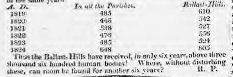 Figures for burials at Ballast Hills 1819-1824. Taken from a letter to the Newcastle Courant, Sunday 12th March 1825 p2. Apologies for the quality, but that is how i the scan appears.