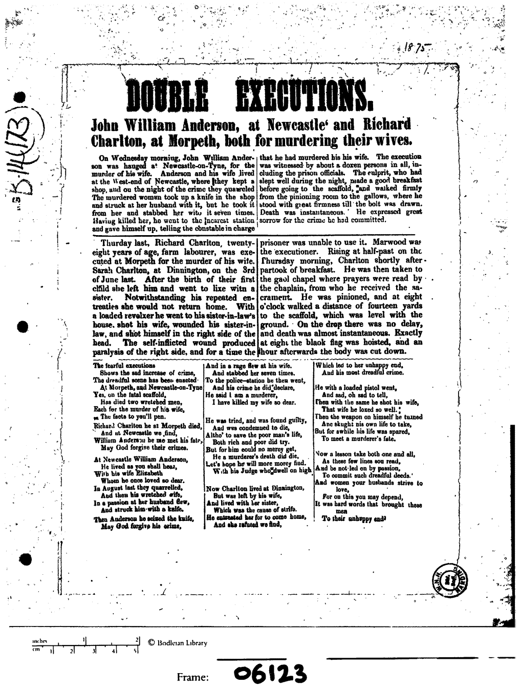 A few minutes after the clock struck eight at Newcastle Gaol some of the ‘listeners imagined they heard the fall of the bolt’, however the paper reported that the black flag ‘had already been unfurled’, which declared that Anderson had ‘surrendered his life in expiation of his crime.’ In both cases, a notice was posted on the exterior of the gaol and a copy of Richard Charlton’s Charlton’s was printed in the Morpeth Herald.
