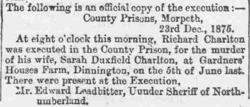 It is…close upon twenty nine years since an execution took place at Morpeth, and that of Charlton is the first private one.