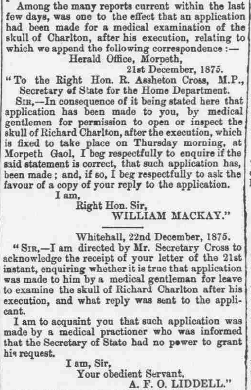 The final note on this sorry tale of execution is a report that can be found in the Morpeth Herald that relates to a a previous interest of mine, as regular readers will know, phrenology. Following his execution, it appears an application was made by a ‘medical gentleman’ to ‘examine the skull’ of Richard Charlton following his execution. A request, much like the calls for reprieve, that the Home Office succinctly denied.