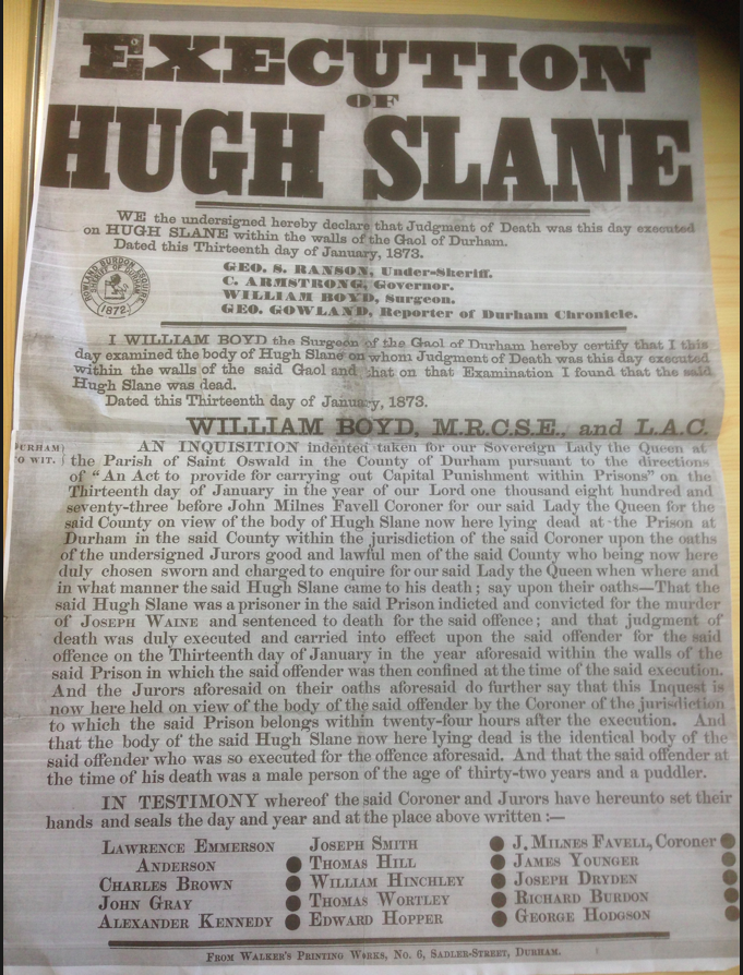 Following the limited success of the first private execution in the North East, the authorities were not called upon to the enact the dread sentence for another four years. But, as if to compensate for the gap, four men were to meet this grisly fate on the same day. The four were Hugh Slane, John Hayes, George Beesley and Terence Rice and they were all indicted for the murder of Spennymoor resident Joseph Waine; Consequently, gaining them the ignominious sobriquet of the Spennymoor Murderers. One of the characteristics I have noticed of crime reporting, particularly capital crimes in the region, is how often, from about the 1820’s onwards, the crimes are linked and referred to by the region as if the stain of the crime resides in the community.