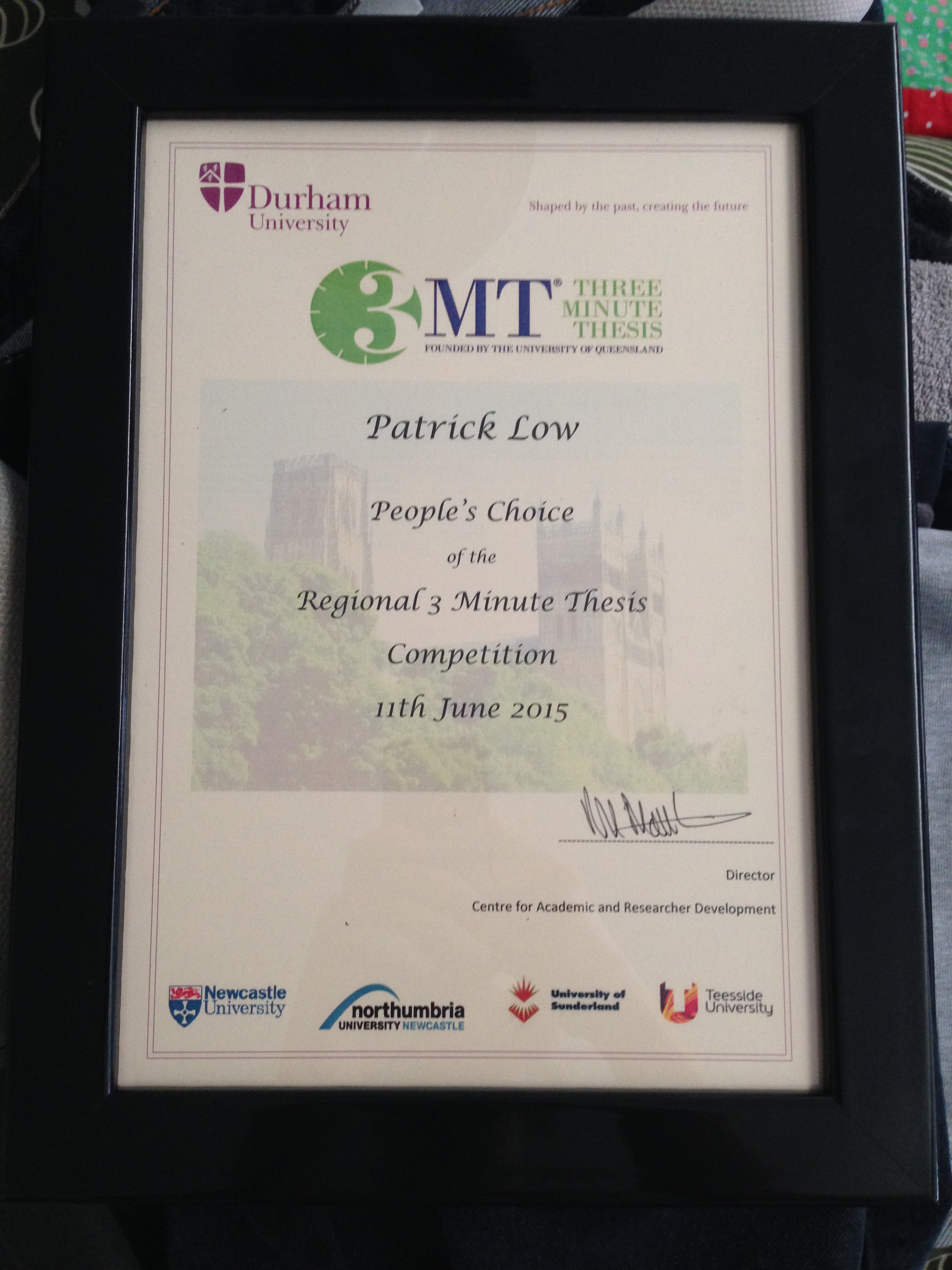 In my last blog, I mentioned that I had been entered into the 3 Minute Thesis competition, a national challenge in which you must summarise your thesis into a, noteless, three-minute presentation that can be understood by a non academic audience. The event was held at Durham University and, much to my surprise, I was lucky enough to win the People’s Choice award and another £100 for being the Runner Up. The overall winner was a female scientist who had done some truly incredible work on cures for male infertility. If there was an academic Top Trumps, I feel a life changing cure tops detailed knowledge of North East executions any day, so she was a very worthy winner! I should add, in case Professor Tim Hunt is reading, that I didn’t once see her cry and I think I can safely say she didn’t fall in love with anyone present in the audience.
